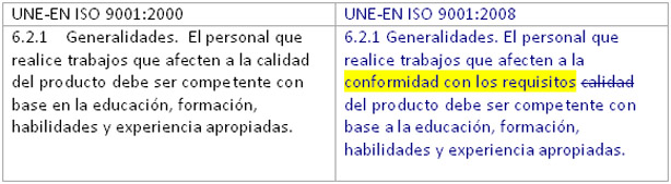 De nuevo cosmética: se aclara que la calidad del producto deriva de la conformidad con los requisitos y que tales requisitos pueden verse afectados por el personal. El énfasis en los requisitos del producto (o servicio) es de agradecer aunque se da por supuesto así como que la conformidad con los requisitos se ve afectada por el personal (educación, formación, habilidades y experiencias).