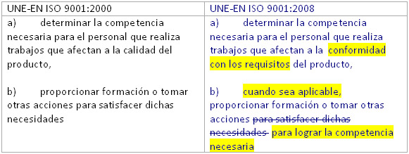 De nuevo se sustituye calidad del producto por conformidad con los requisitos asimismo se introduce la aclaración de que la competencia necesaria debe obtenerse mediante la formación u otras acciones cuando sea aplicable lo cual relaja la interpretación de la norma ¿cuándo es aplicable y cuándo no?