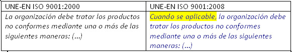 Se introduce la expresión “cuando sea aplicable”. Se supone que la aplicabilidad debe quedar recogida en el procedimiento documentado “control de producto no conforme”