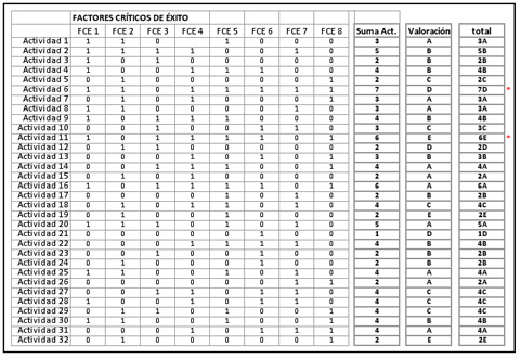 Determinadas las actividades se construye una matriz de relaciones (vale un hoja de cálculo) en la cual se disponen los factores críticos de éxito en las columnas a razón de uno por columna y las actividades en las filas (una por fila).