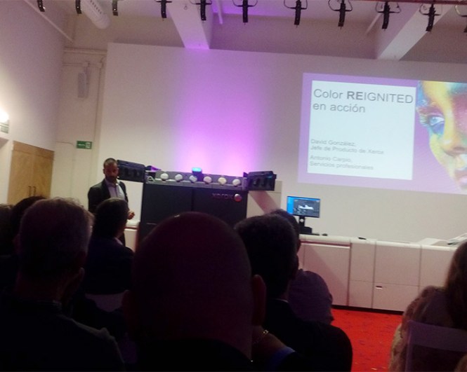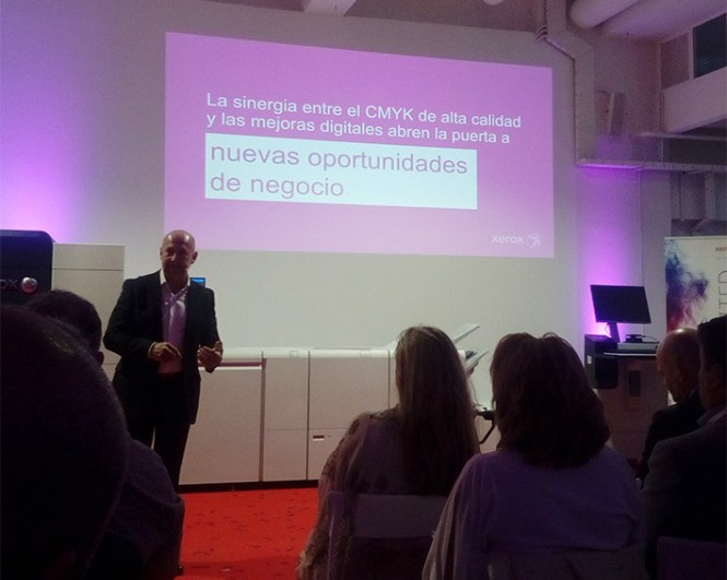 Yo particularmente estaba sumamente interesado en esta presentación dadas las noticias que me habían llegado: una impresora de tecnología láser (electrofotografía) que añade a la impresión de cuatricromía la posibilidad de imprimir colores directos clave: oro, plata y barniz lo que dota a esta impresora de funcionalidades de sumo interés para todos los mercado y para algunos muy concretos.