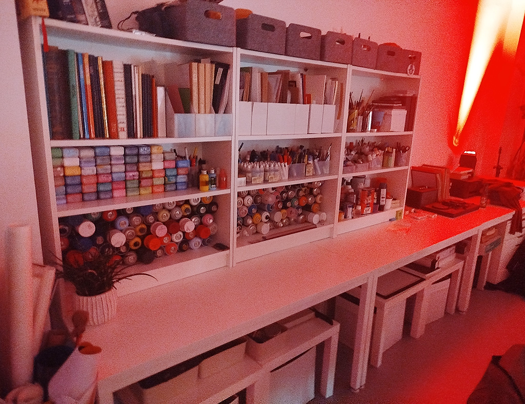 Nos encontramos con un precioso estudio en la calle Fuencarral, que comparte-disfruta con otros equipos-estudios-empresas-amigos…, y en el cual realiza las deslumbrantes creaciones que podemos admirar en su web.