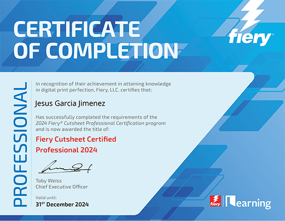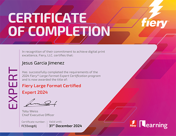 Un año más, he pasado el trámite de la certificación Profesional de Fiery en hoja cortada y Experto en Gran Formato y como en anteriores ocasiones recomiendo a aquellos implicados de alguna manera en la Impresión digital y en general en cualquier profesión, a utilizar los recursos que las empresas ponen a disposición en Internet, que tienen un alto valor formativo y que permitne mantener el currículum actualizado.