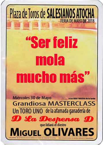 Tal vez la confusión hubiera sido menor si hubiera sustituido el lema de la Masterclass «Ser feliz mola mucho más» por la imagen del torero, que también barajé, pero entendí que quitar la imagen desvirtuaría el cartel definitivo demasiado: