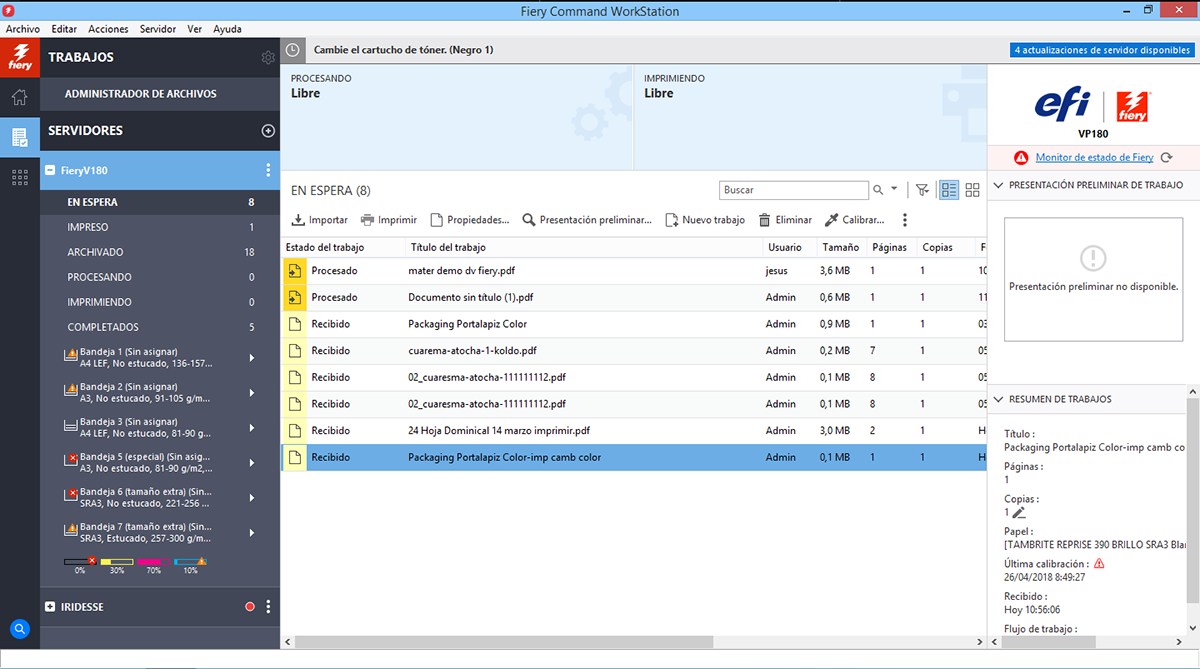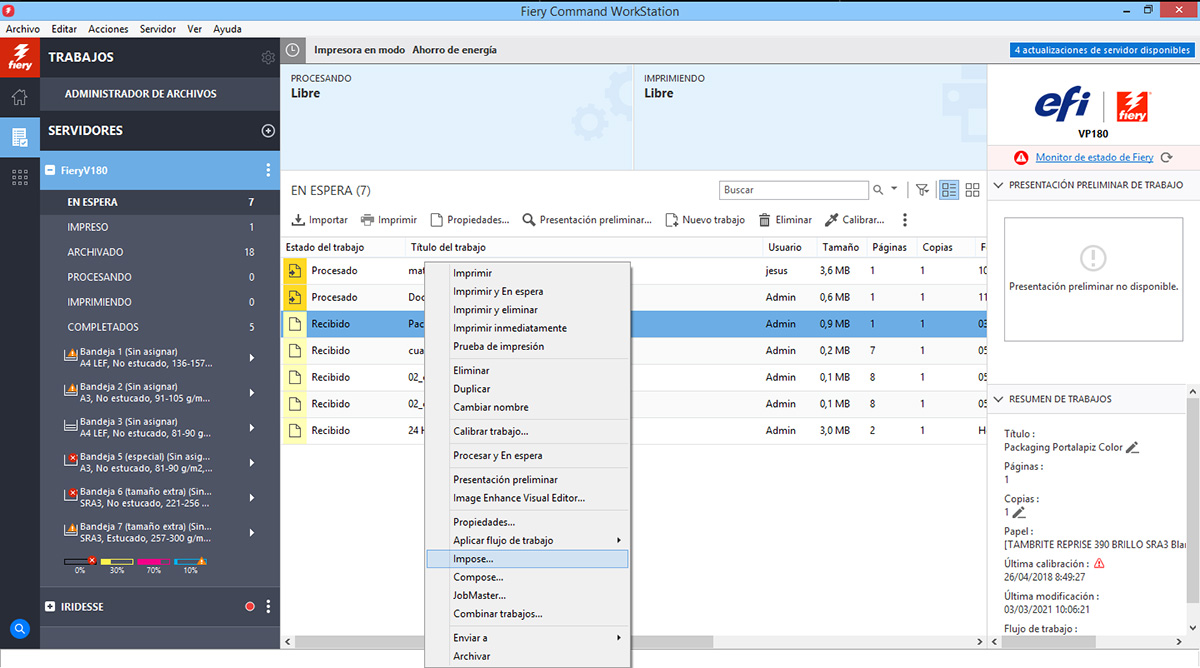 Para ello, una vez añadido el pdf a la cola de espera de la Commandwork Station, la interface del Servidor Fiery, conectada en este caso a una Xerox Versant 180…