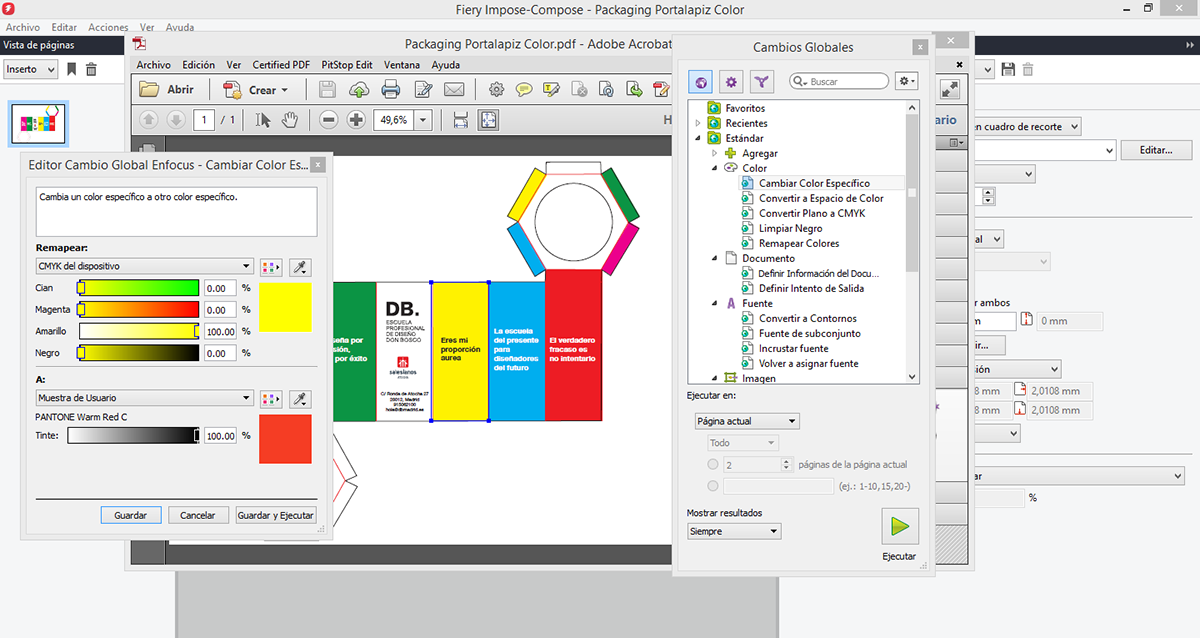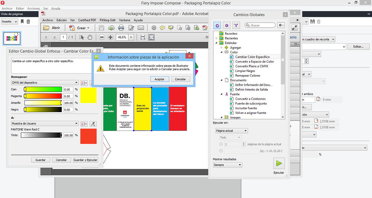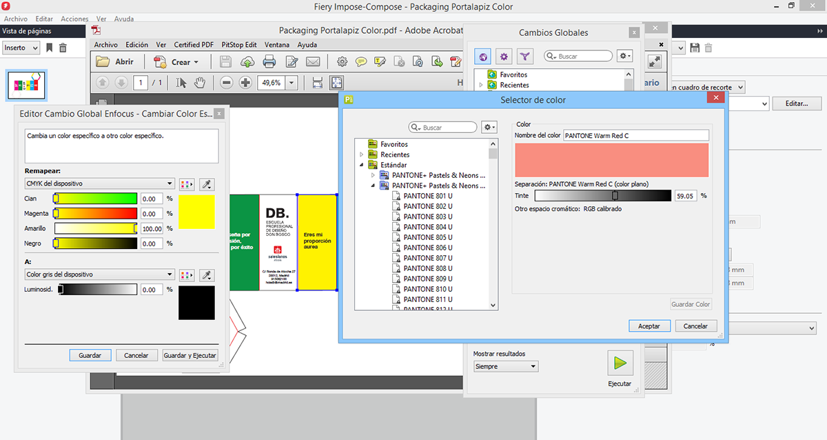 En el caso de muestra, el cliente pretende cambiar un color – en el ejemplo, un amarillo de cuatricromía por un Pantone Warm Red–