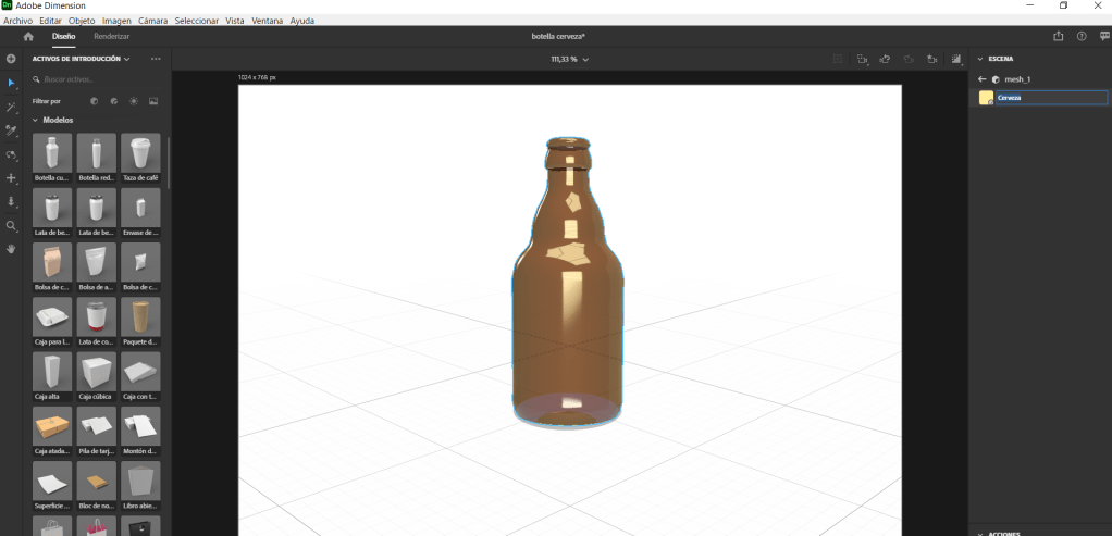 En el ejemplo presentado ya se ha aplicado un material al producto, en este caso el cristal de una típica botella de cerveza (de hecho una de las propuestas tiene ese nombre).