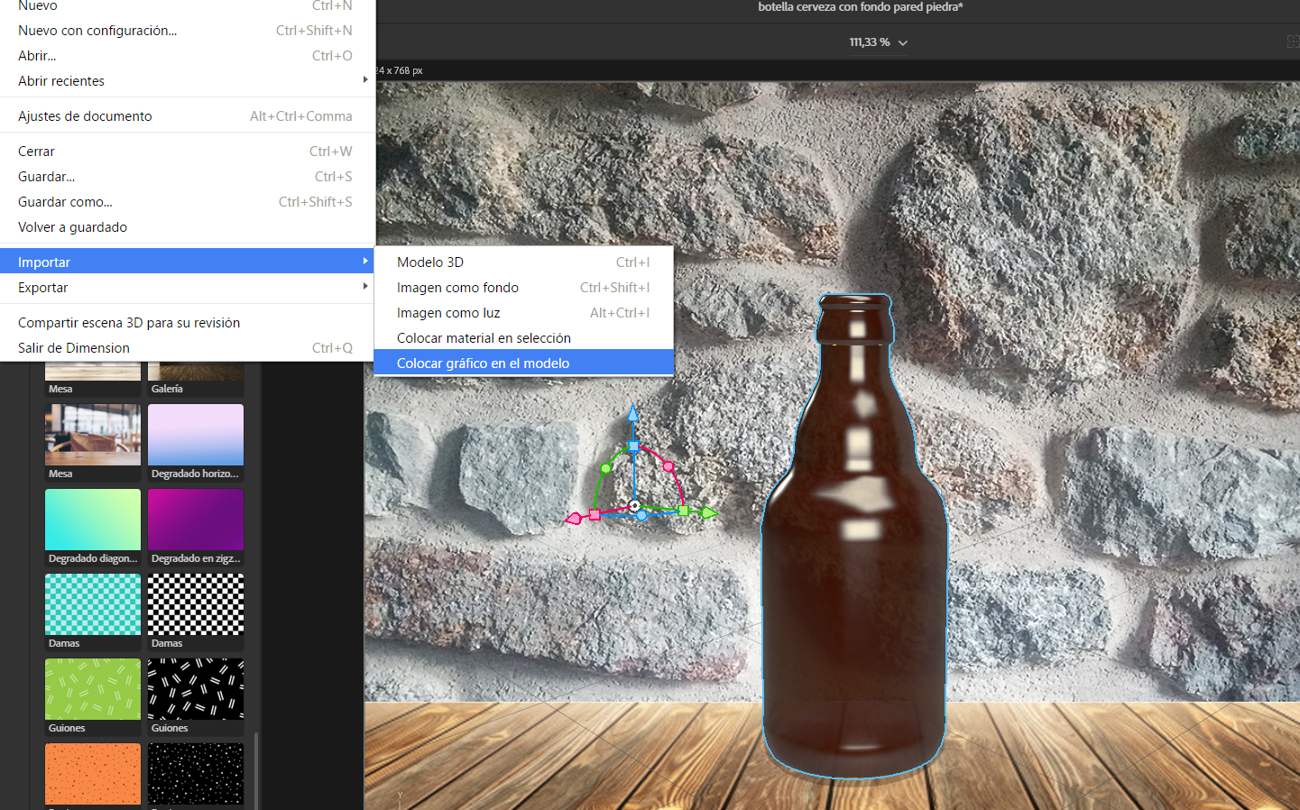 El siguiente paso será el de colocar el gráfico en el modelo, de tal manera que se simule la etiqueta o impresión. Las opciones pasan por colocar texturas en todo el modelo (que no es este el caso), a modo de etiqueta o una simulación de una impresión directa (que bien pudiera ser la serigrafía).