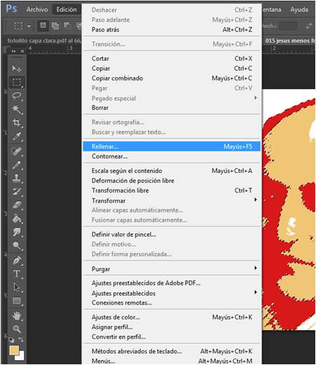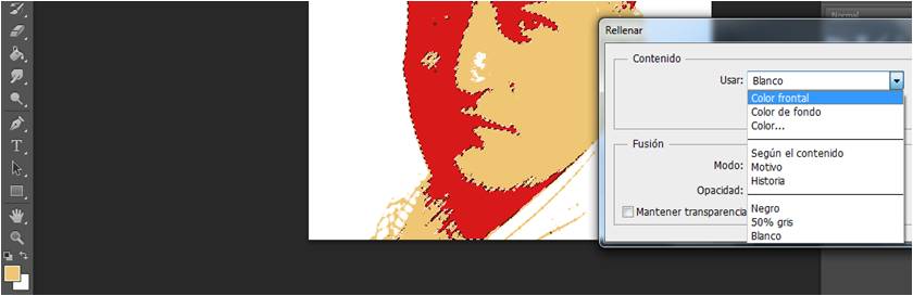 - Sustituimos el color oscuro seleccionado con el color claro que hemos tomado de muestra Menú > Edición > Rellenar… > Color frontal