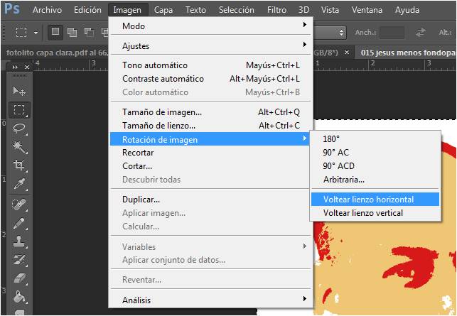 - Si el proceso es indirecto (serigrafía, linóleo) debemos aplicar espejo a la imagen (sobre todo si hay texto): Menú > Imagen > Rotación de imagen > Volteo lienzo horizontal