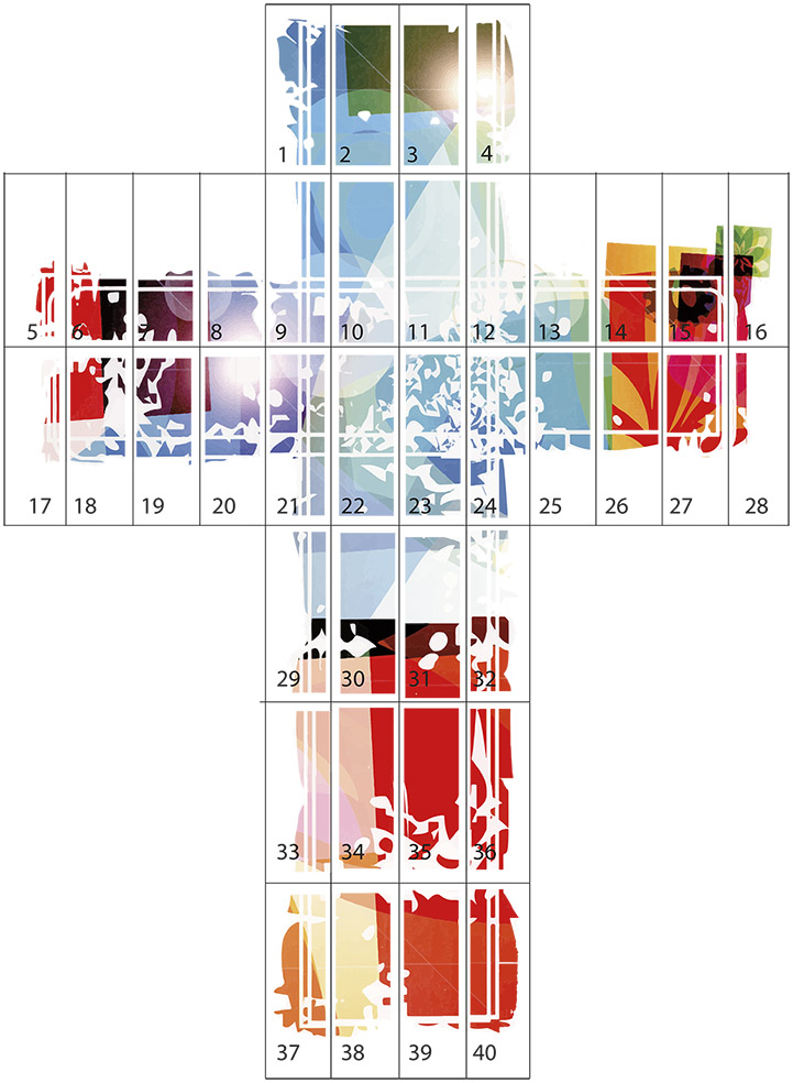 A continuación el esquema de panelado para realizar el posterior montaje, cada rectángulo numerado se imprimió en la HP con un formato de 90 x 250 cm.